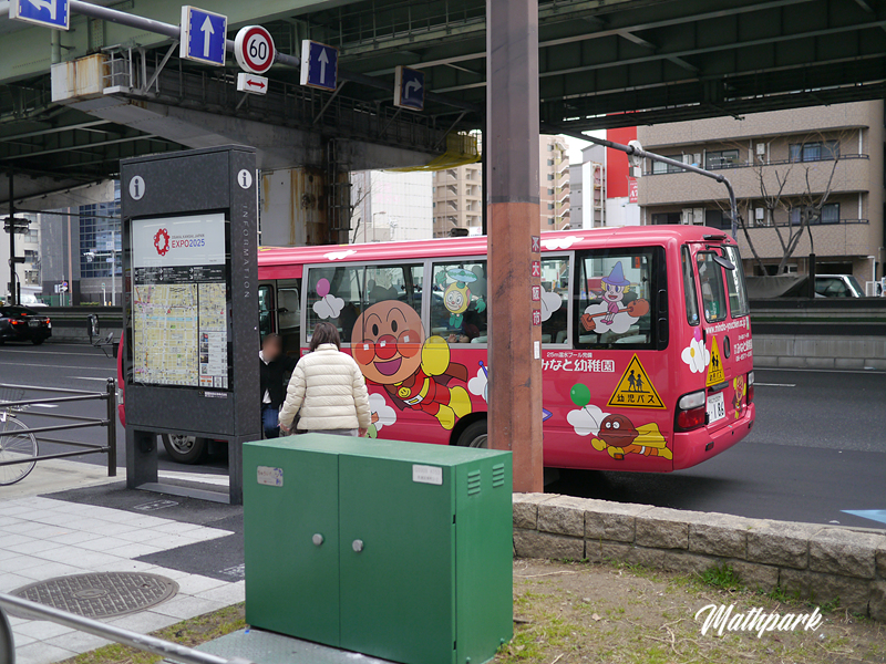 유치원 하교 시간인지 깜찍한 호빵맨 버스가 아이들을 내려주고 있네요.