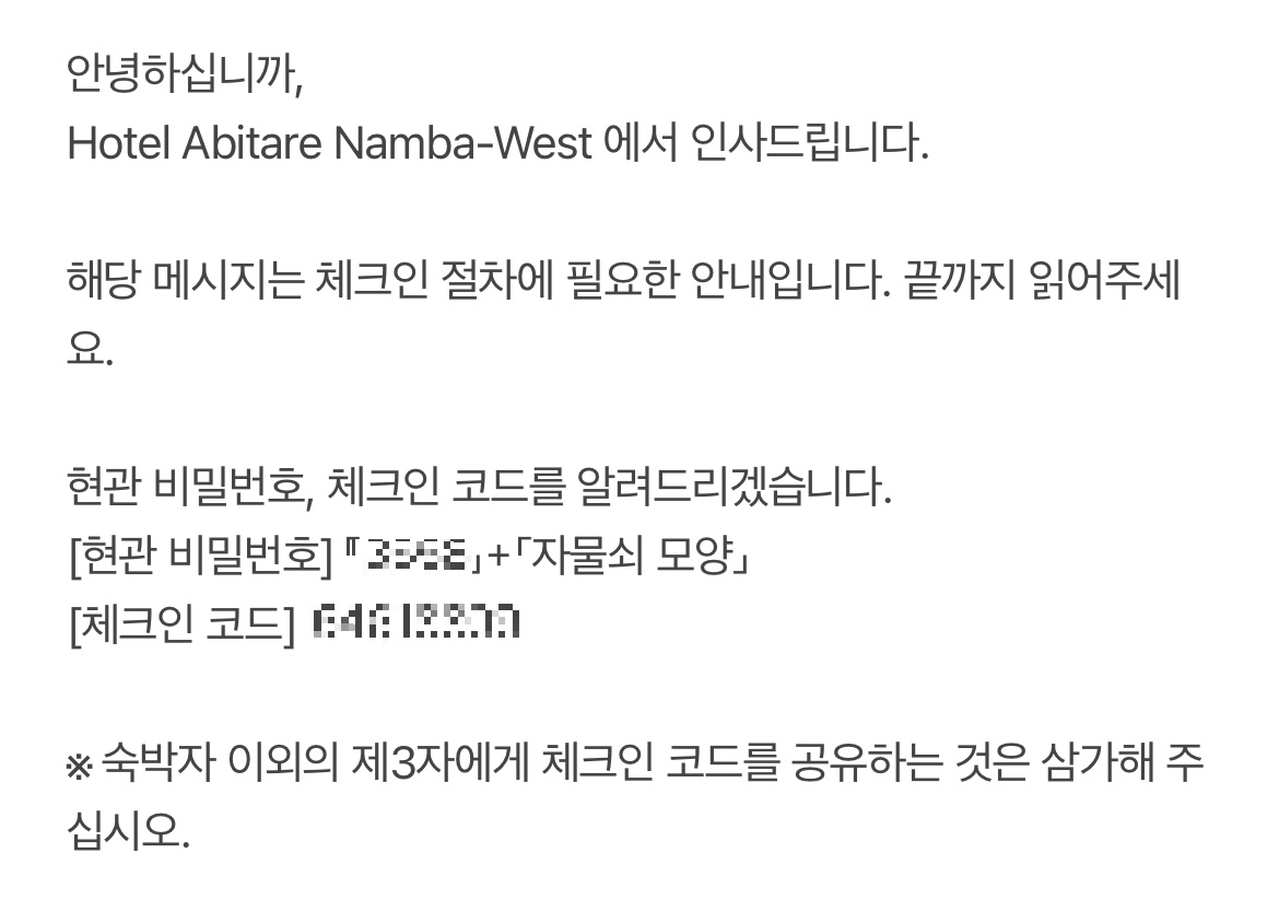 이메일로 받은 현관 비밀번호를 이용하여 드나들 수 있고 체크인 코드는 이따가 체크인할 때 인증용입니다. 모든 절차가 무인으로 이루어집니다.