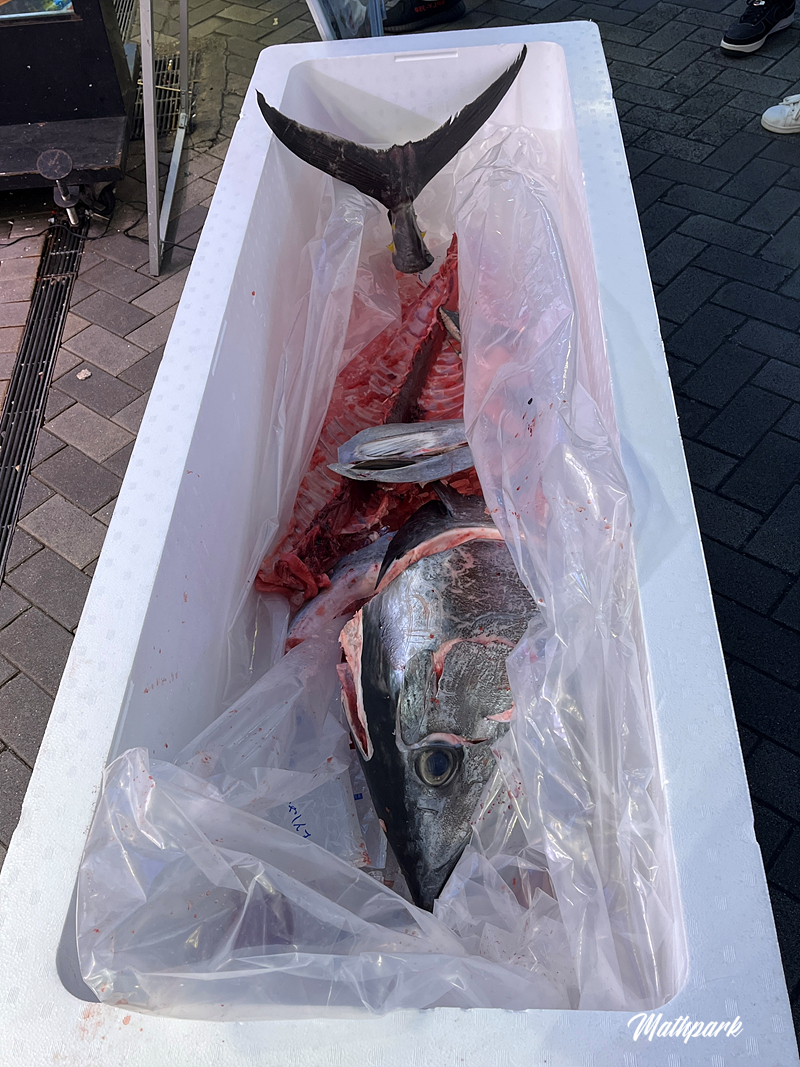 해체작업 중이었을 참치를 입구에 전시해 놓으니 지나가는 사람들의 눈길을 끌고 발걸음이 가게로 향하게 만드는군요.