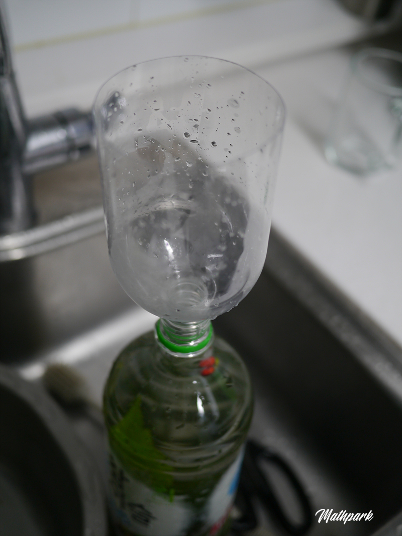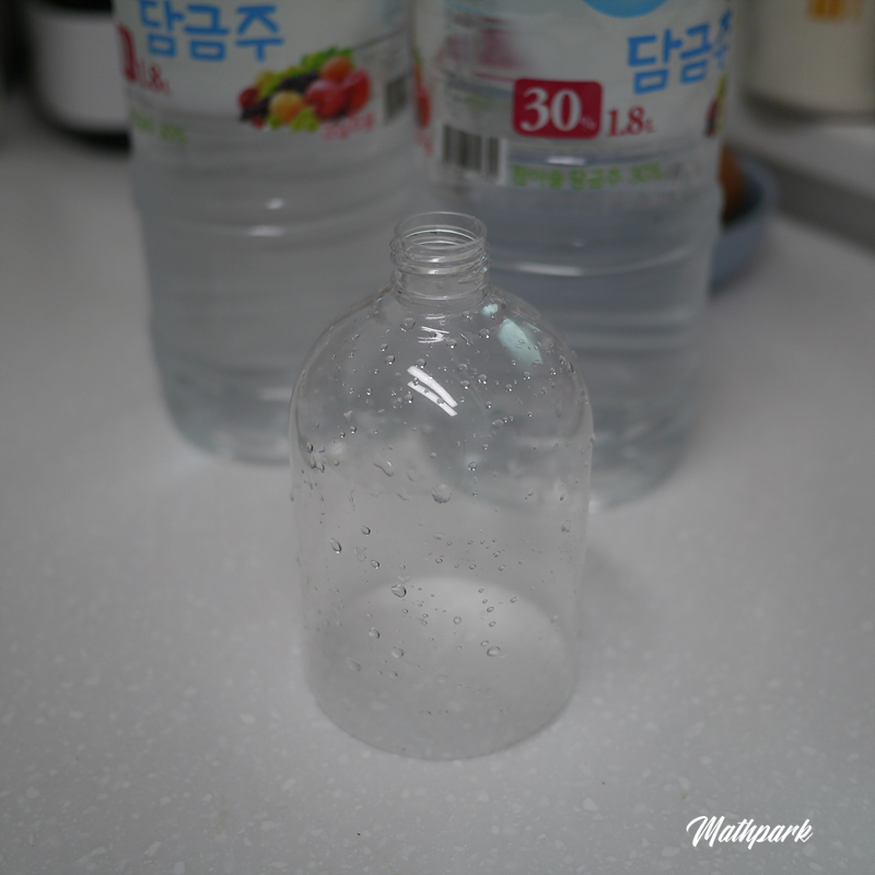 30도짜리 담금주를 사오긴 했는데 아뿔싸, 우리 집에는 술을 담을만한 술병이 없다는 뒤늦은 깨달음. 그렇다고 다시 나가 사 오기도 귀찮고 처음 시도하는 건데 굳이 멋진 병까지 사긴 아까와서 짱구를 굴리다가 응? 어차피 술이 담긴 용기잖아? 저기에 그대로 넣어서 보관해도 되지 않을까?라는 천재적인 발상을 하게 됩니다(물론 유리병이 좋긴 하겠지만). 그런데 병 입구가 좁아서 나중에 술을 다시 담을 때 깔때기가 있어야 하는데 집에 깔때기도 없어서 마침 주둥이가 살짝 작은 페트병이 돌아다니는 걸 발견하고 잘라서 깔때기로 사용하기로 합니다.