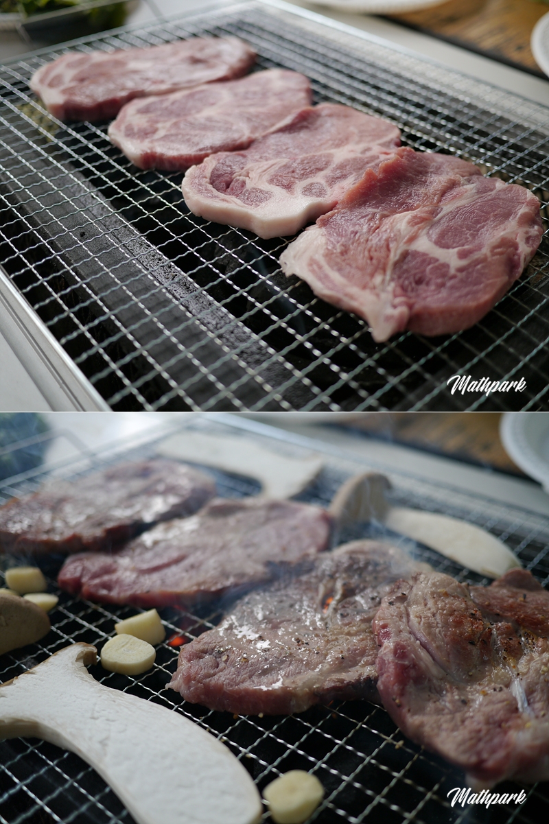 특급 목살을 구우며 본격적인 저녁 식사를 시작합니다.
