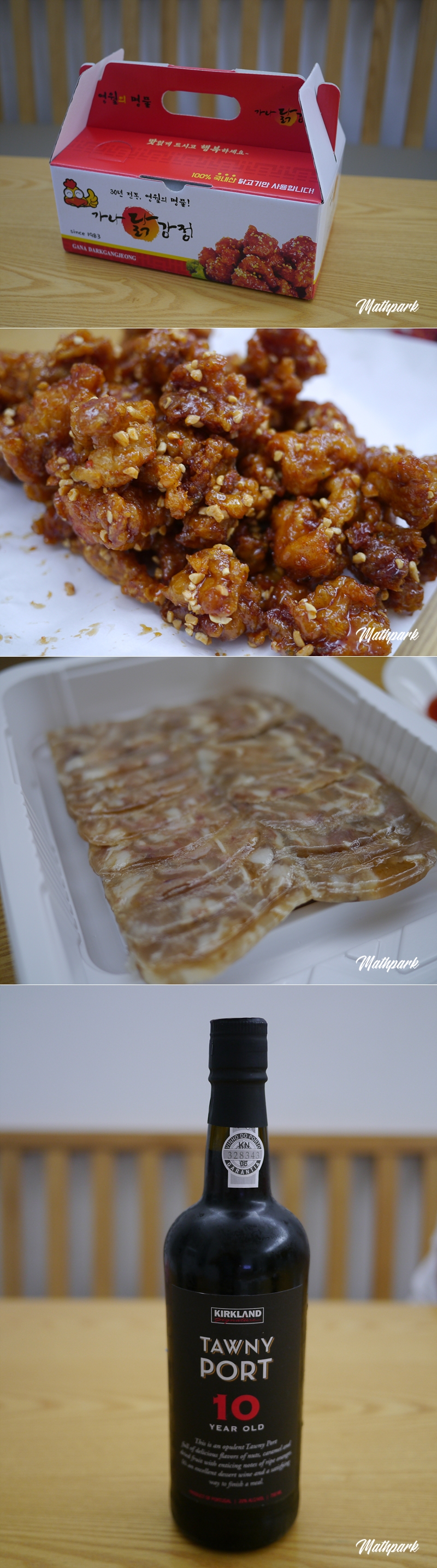 시장에서 포장해 온 닭강정과 집에서 싸가지고 온 편육과 맛 좋은 포트와인을 곁들이며 하루를 마감합니다.