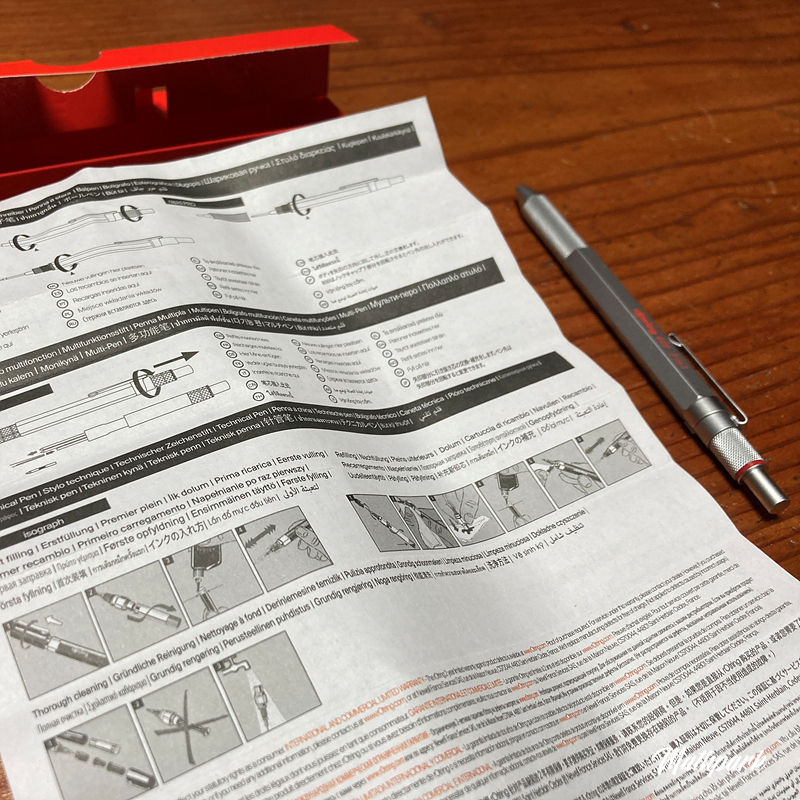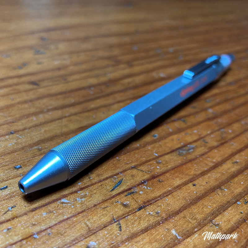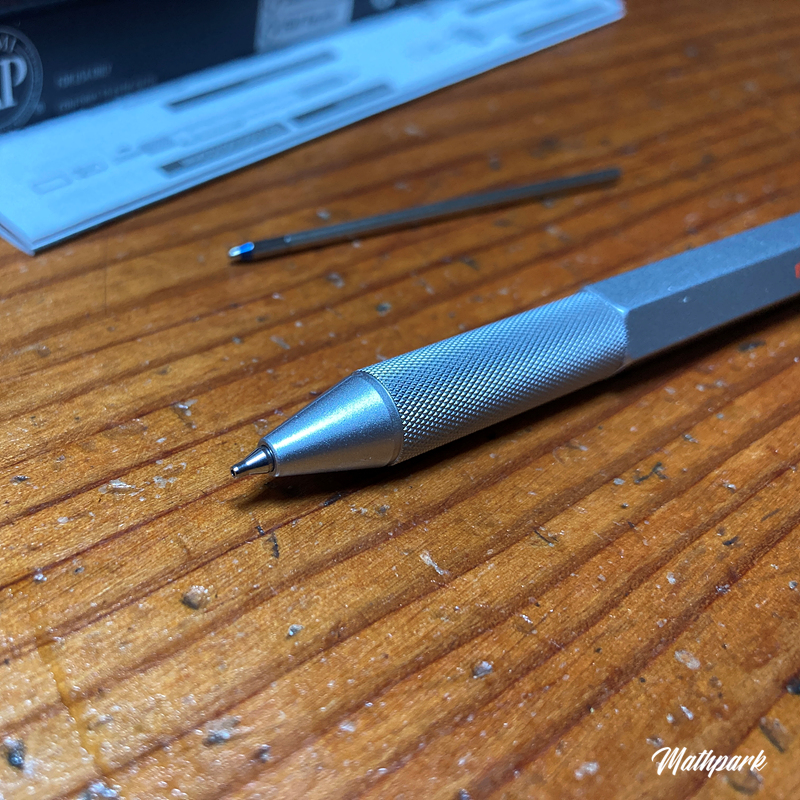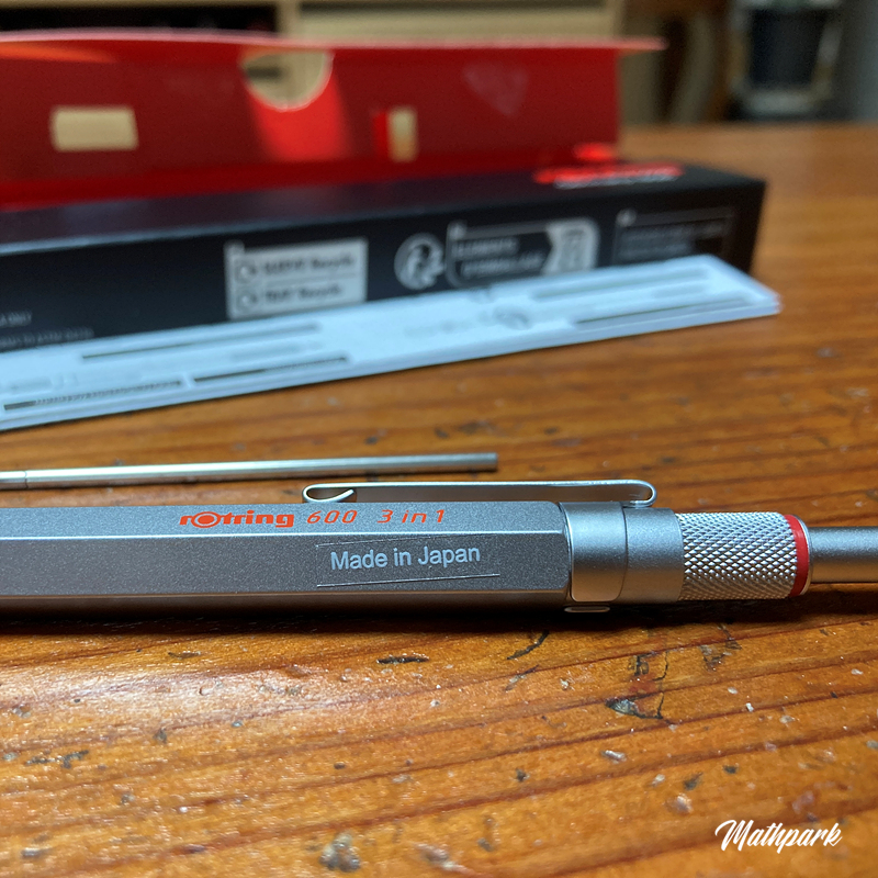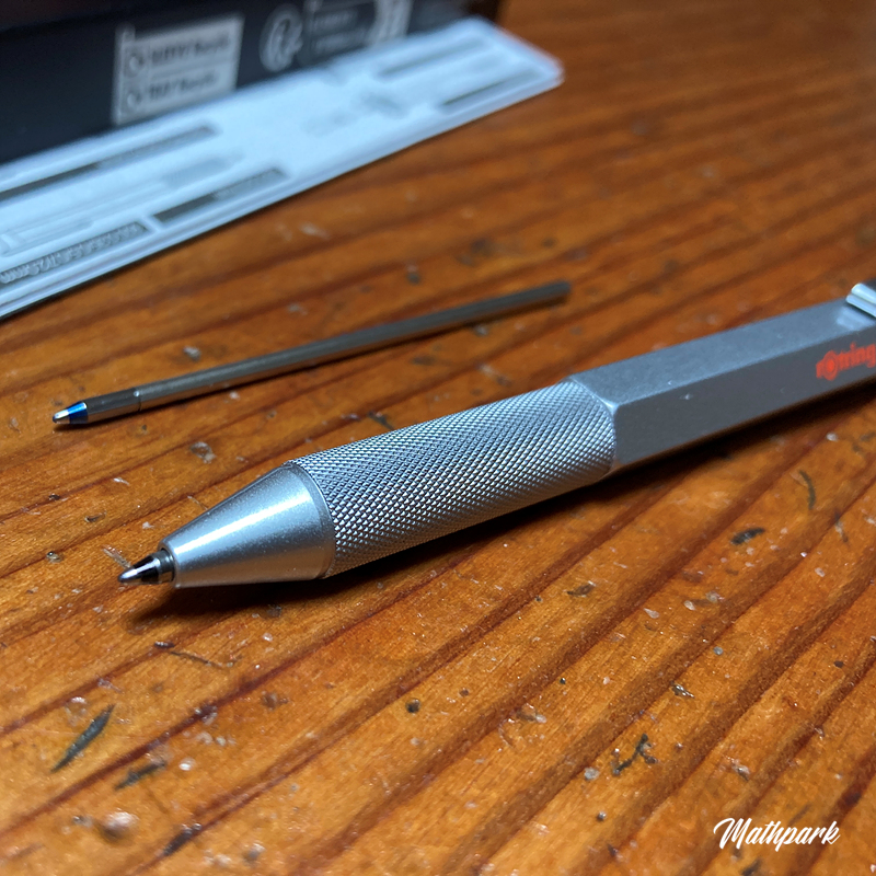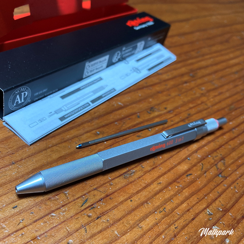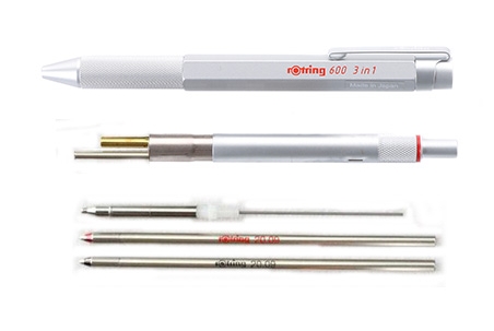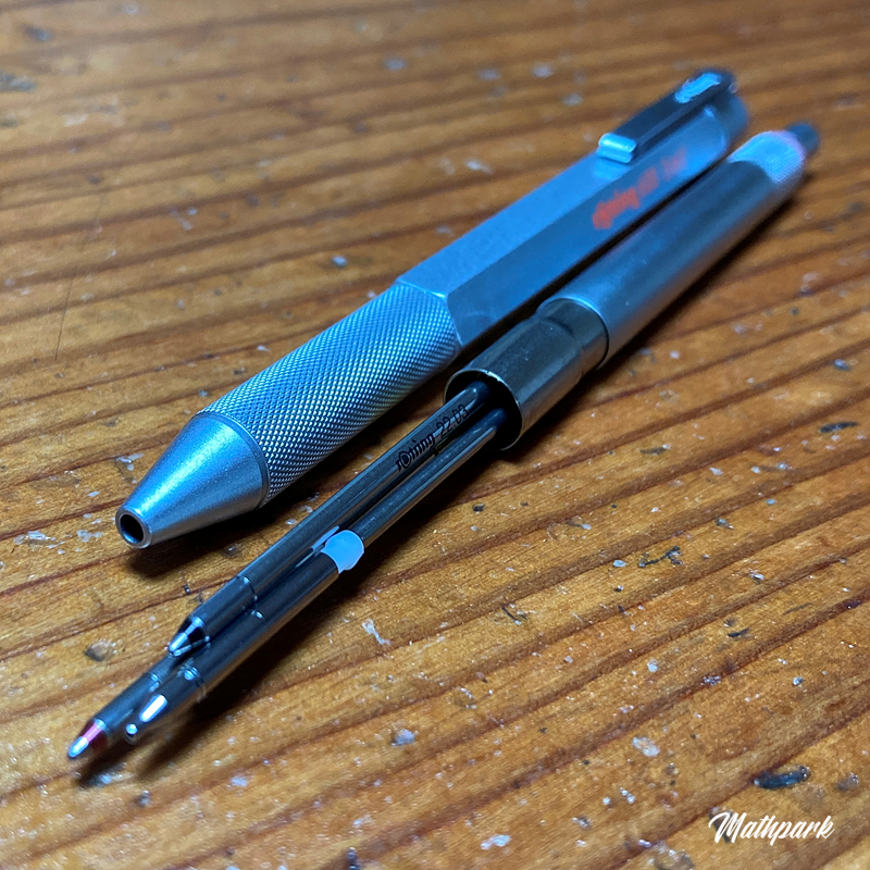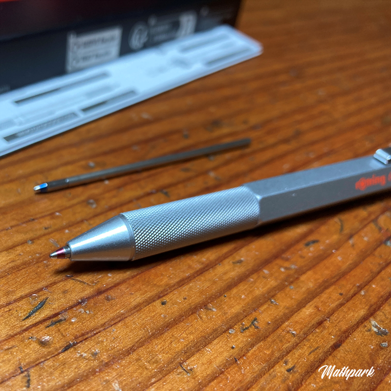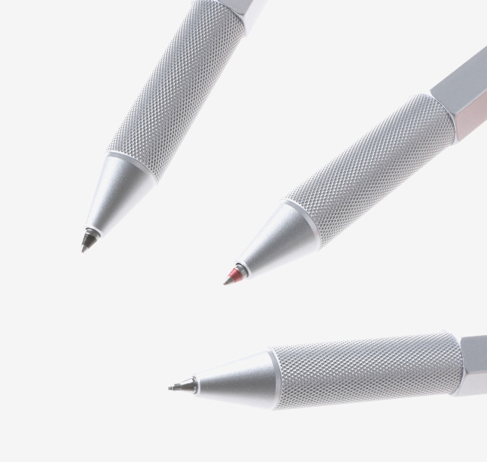 검정 볼펜, 빨간 볼펜, 0.5mm 샤프가 기본으로 장착되어 있으며 파란 볼펜심 하나가 선물처럼 추가되어 있습니다.