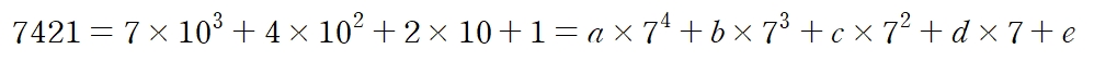 여기서 7^4=2401이기 때문에, 7421을 7진법으로 바꾸면 5자리의 수가 되고, a, b, c, d, e는 0부터 6까지의 정수이다. 위 식에서 진수를 의미하는 10과 7을 각각 x, x-3이라고 하면