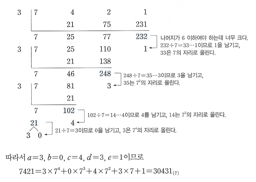 과정이 복잡해 보이지만 사실 기수법은 숫자 놀이에 불과하다. 자릿수 기수법에 대한 이해를 바탕으로 나눗셈의 몫과 나머지를 잘 구하면 된다.