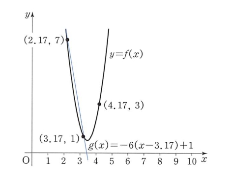 y=g(x)의 그래프와 y=f(x)의 그래프가 두 점 (2.17, 7), (3.17, 1)에서 만나도록 그리면 다음과 같다.