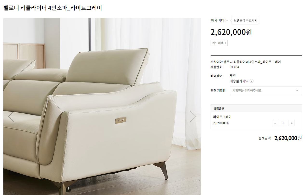 바로 옆에 있는 까사미아 매장에 들러 구경하다가 리클라이너 소파에 완전 매료되어 마침 세일도 한다기에 질렀습니다. 인테리어 공사는 아직 시작도 하지 않았는데 괜히 마음이 들떠 벌써부터 지갑을 열기 시작했으니 큰일입니다.