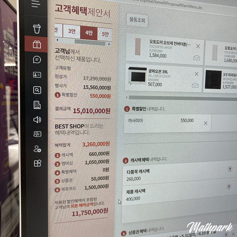이렇게 무리하게 예산을 초과해 가며 가전제품을 추가한 이유 중에 하나는 결제금액이 클수록 당연하게도 할인 혜택이 많아져서 1200만 원어치를 사나 1500만 원어치를 사나 별 차이가 없는 것을 보고 될 대로 돼라...라는 심정도 작용했을 것이지만 무엇보다 새 제품을 거의 안 사고 중고 물건을 어디선가 구해와서 십몇 년 이상 묵묵하게 잘 사용해 온 아내에 대한 보답이라고 여기니 뭐 괜찮습니다. 가전은 LG라고 했으니 앞으로 오랫동안 또 잘 쓰겠지요.