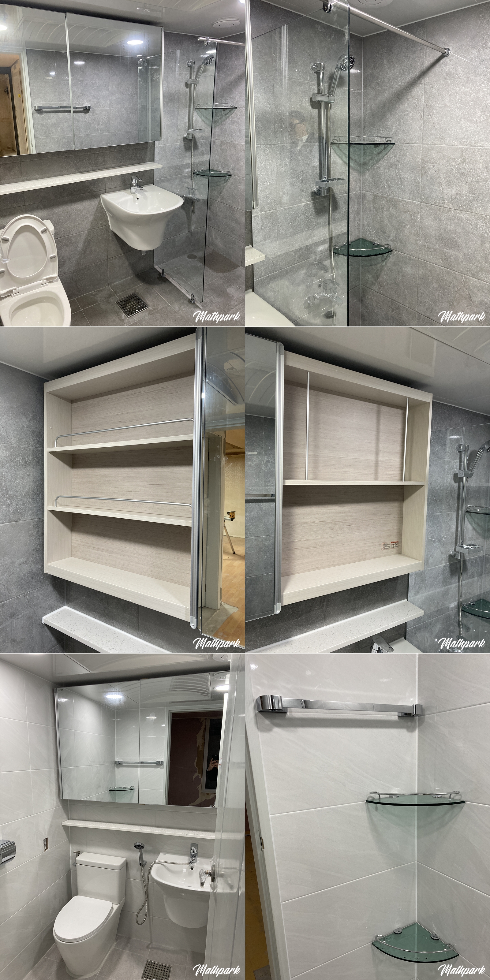 이제 본격적으로 욕실 공사가 시작되었습니다. 거실 욕실은 그레이톤으로, 안방 욕실은 화이트톤으로 결정했습니다.
