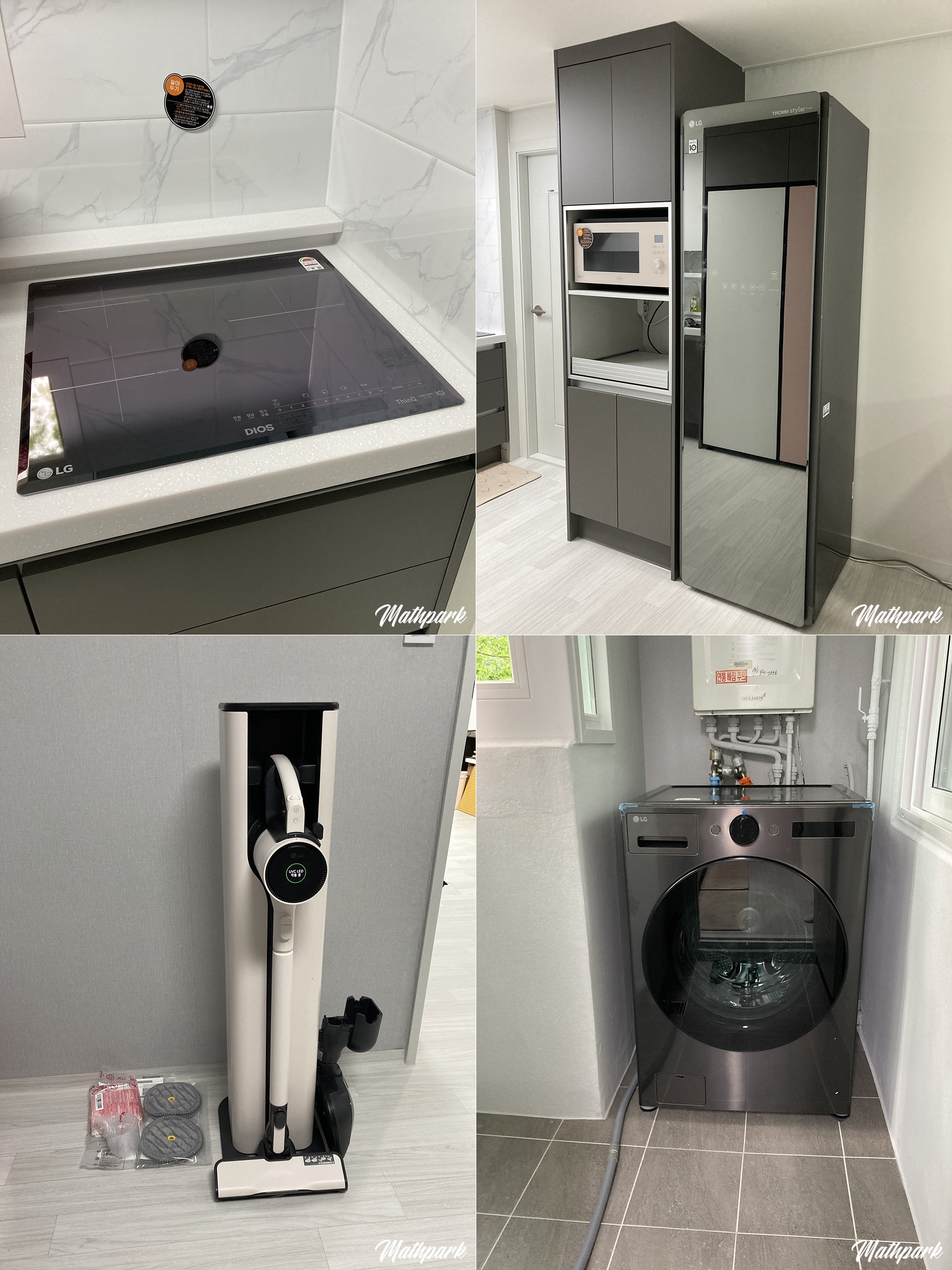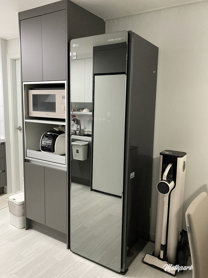 인덕션, 광파오븐, 청소기, 세탁기도 각자의 위치로. 원래 사용하던 스타일러는 둘 곳이 마땅치 않아 그냥 키 큰 장 옆에 붙이니 그럭저럭 나쁘지 않습니다.