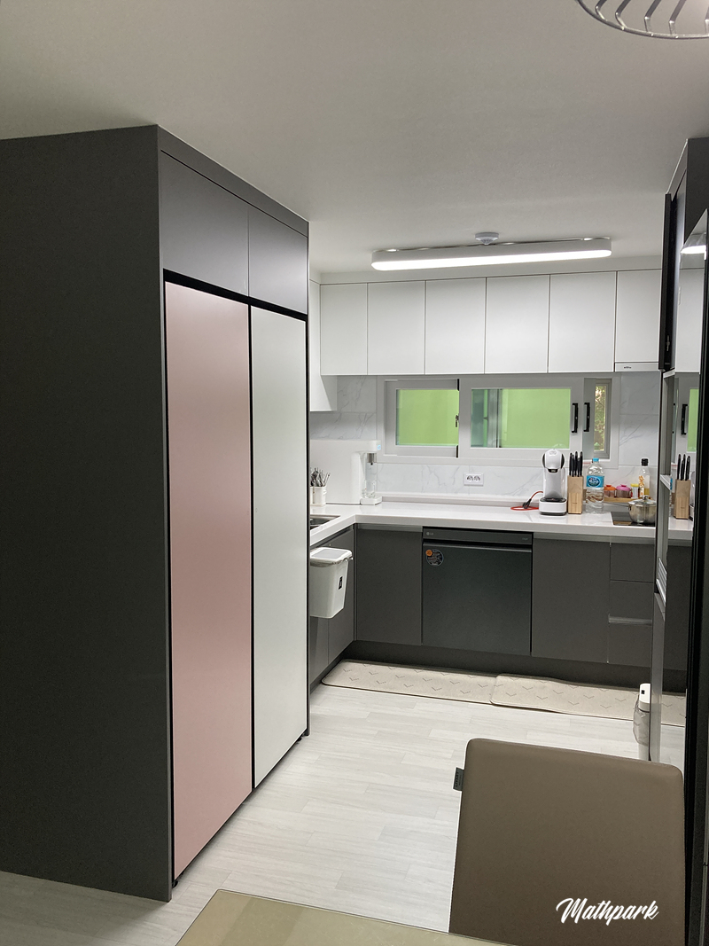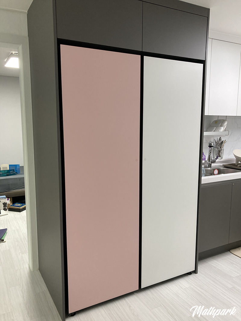 사전에 측정해둔대로 냉장고가 냉장고장에 딱 맞게 들어갔습니다. 핑크와 베이지 컬러가 제법 귀엽습니다.
