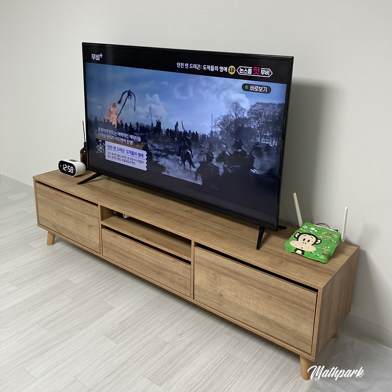 TV가 도착해서 설치해놓고 보니 이번에는 TV 스텐드장이 너무 작아 보입니다. ㅋㅋㅋㅋ 무게 때문에 위태로워 보이기도 하고 영 불편합니다.