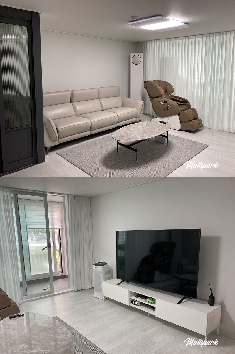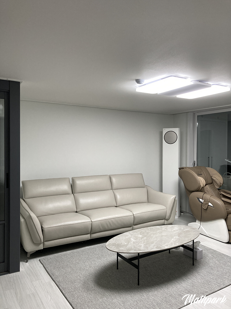 소파와 티테이블과 안마의자도 제자리에. 안마의자의 색깔만 튀는 것이 보기 싫지만 더 이상은 무리입니다.