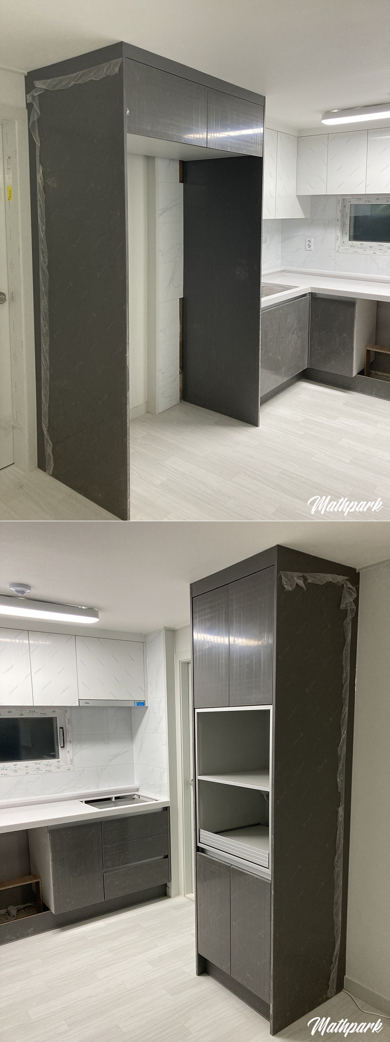 주방에 냉장고장과 키큰장이 설치되었습니다.