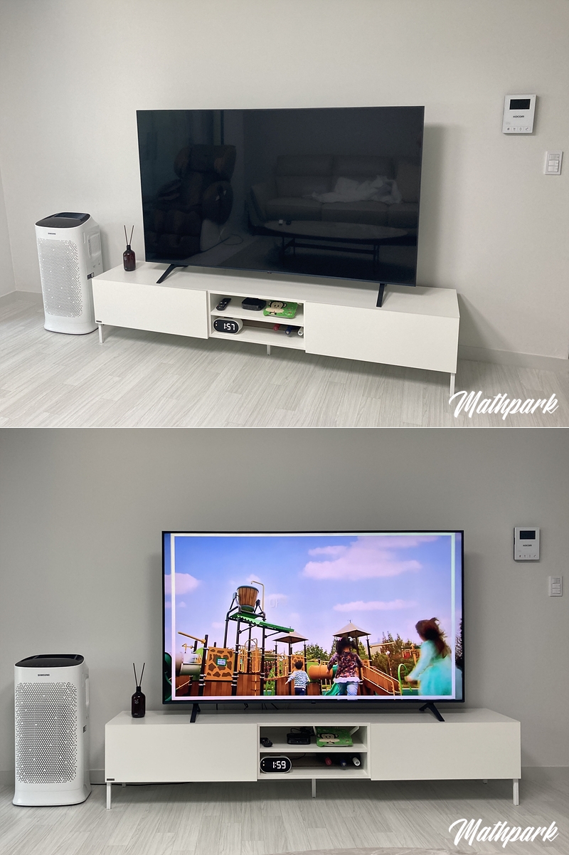 TV가 도착해서 설치해놓고 보니 이번에는 TV 스텐드장이 너무 작아 보입니다. ㅋㅋㅋㅋ 무게 때문에 위태로워 보이기도 하고 영 불편합니다.