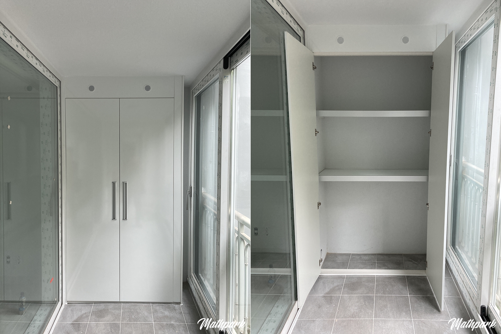 거실 베란다 한쪽에 작은 창고가 있어 자질구레한 물건들을 수납했었는데 그것만으로는 부족하여 반대편 끝에 커다란 장을 짜 넣어 보다 넓은 수납공간을 확보했습니다.