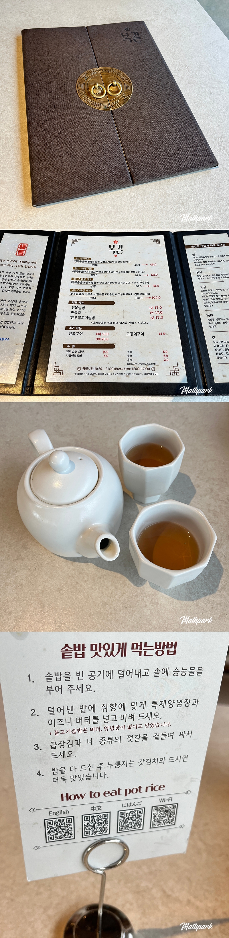 매장 분위기 차분하고 군더더기 없이 깔끔하며 메뉴도 단출합니다. 먹는 방법이 테이블마다 친절하게 안내되어 있습니다. 주문한 음식을 기다리는 동안 허전함을 달래줄 작두콩차도 맛있습니다.