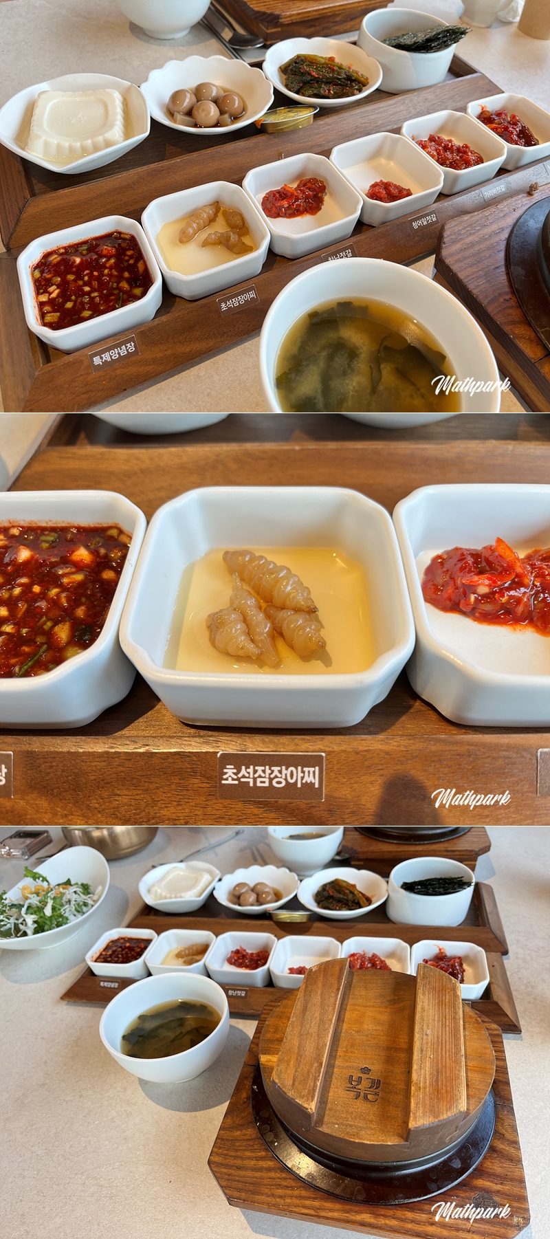 밑반찬들이 깔리고 메인 메뉴들이 등장합니다. 특히 젓갈 종류가 다양했는데 초석잠장아찌는 처음 먹어보는 거라 신기합니다. 생긴 건 애벌레 같으나 아삭아삭한 식감이 괜찮습니다.